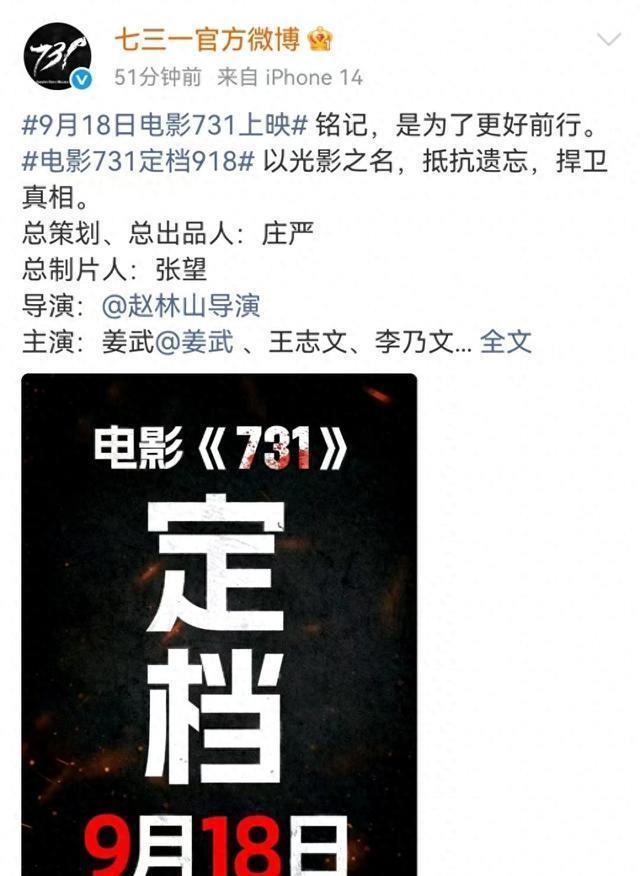 最后,就是预映未实现,定档918。 之前说的7月31日全球预映未能如约,大家猜测这个档期并不是很好,前面爆了一部《南京照相馆》,后面管虎的《东极岛》来袭,如果强行在7月31日上映,可能会被打成渣渣。 但啡哥不这么认为,这种类型片的档期,一定会是总局统筹安排,并不是片方想什么时候公映,就能公映的。 从918档期来看,此片完全是国家层面需要的,今年是抗战胜利80周年,电影的主题便是 铭记历史,勿忘国耻和吾辈当自强。