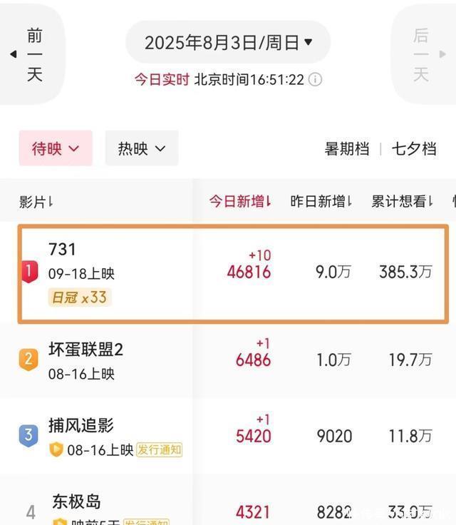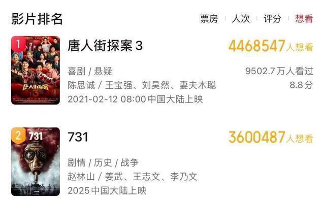 截至发稿时,《731》的平台想看指数达到385万人次,早就超过中国影史票房第一的《哪吒2》想看指数,距离想看指数第一的《唐人街探案3》,还有60万人次差距。 电影还有一个多月才能上映,超过《唐探3》毫无悬念,这个宣发想看指数,是可以直接转换成真金白银的,换一句话说, 《731》已经有了一个票房基本盘。